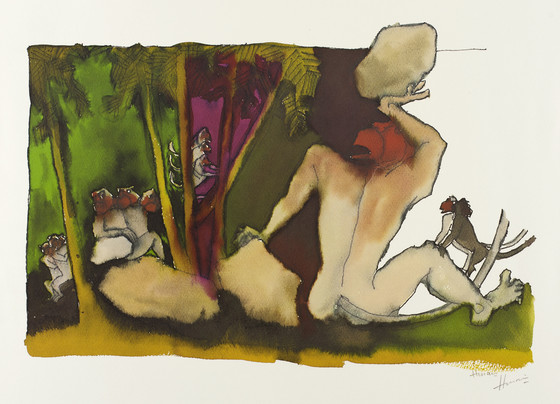 Hanuman and the Monkeys Gathering Boulders and Trees to Build the Bridge to Lanka, Folio from the Hanuman Series
