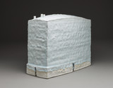 Yoshikawa Masamichi was born in Kanagawa Prefecture, on Sagami Bay, but having graduated from The Japan Design Academy in Tokyo in 1968, he moved to Tokoname in central Japan, and was trained in the studio of Sugie Takumi. He established his own kiln in 1975. Yoshikawa works with a bluish celadon glaze on porcelain (seihakuji), or sometimes blue and white, which is traditionally applied to a smooth surface. Yoshikawa has developed his own techniques of heavily applying the celadon glaze and arranging for drips to occur in specific locations. He carves each face of an object with sharp tools and presses with his fingers for a textured surface on which the celadon glaze reflects variously as one moves by. Fascinated by Han Dynasty Chinese funerary villages and buildings (see M.2012.108.1), Yoshimichi’s designs are based on these structures and slab built. Though fragile, his sculptures evoke solidity. Yoshimichi teaches now at Nagoya University of the Arts, and has had solo shows across the globe. He won grand prizes in 1981 and 1983 at the Asahi Ceramics exhibition. In 2002, he garnered a gold prize for his work at the International Biennale of Ceramic Art Vallauris, France. For his talents, Aichi Prefecture gave him their arts and culture award in 2005. His works are in the collections of the Metropolitan Museum of Art, the Museum of Arts and Design, New York, the Victoria and Albert Museum, and innumerable museums in Japan and across Asia.
