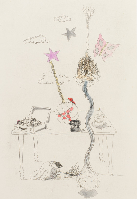 Copper plate etching, watercolor on paper, chine colle