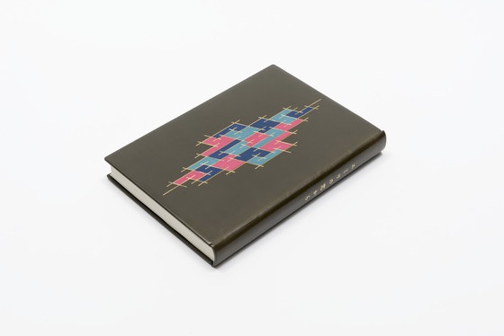 Hardcover book: dark olive calf leather with onlays of pink, turquoise and dark blue leathers, gold tooling, endsheets gray-green paper, slipcase: paper on board and leather