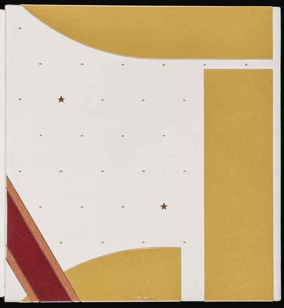 Hardcover book with slipcase: blue leather with on-lays of red, pink, green, gray and yellow leathers, gold tooling, end-sheets of paper; tipped in woodblock printed illustrations; slipcase: tea green paper, blue leather edges
