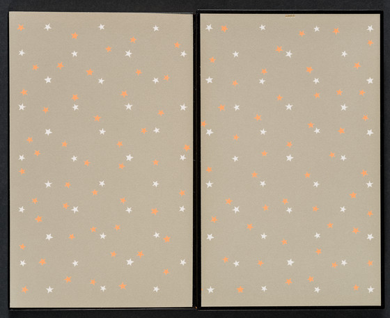 Hardcover book with box; book of dark blue leather with on-lays of red and blue leathers; gold tooling; end-sheets paper printed with star pattern; dark blue buckram box with suede lining