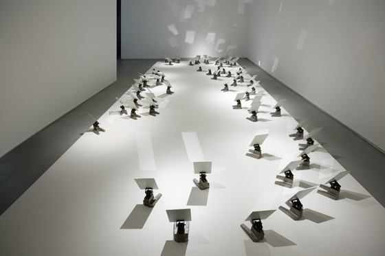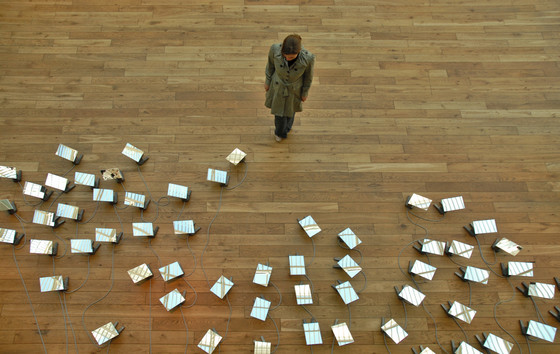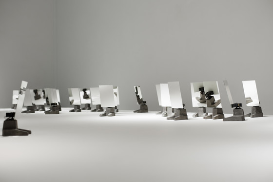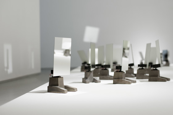 Mirror, metal cast bases, motors, custom motion tracking software, camera, computer