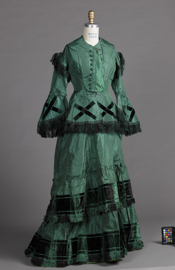 Day bodice: silk plain weave (taffeta), silk velvet with satin weft patterning, silk braid with fringe; Evening bodice: silk plain weave (taffeta), silk braid with fringe; Skirt: silk plain weave (taffeta), silk velvet with satin weft patterning and silk fringe; Belt: silk plain weave (taffeta) and silk velvet with satin weft patterning; Flounce: silk plain weave (taffeta) with satin weft patterning and silk fringe, silk velvet