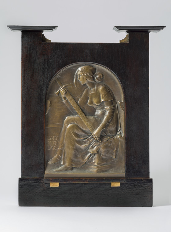 The Lady of the Lake comes from a series of nine relief panels, each depicting a heroine from Sir Thomas Malory’s Morte d’Arthur, which Frampton originally designed in 1895 for a door in the London home and office of American business magnate William Waldorf Astor. The building’s architect, J. L. Pearson, had commissioned Frampton along with several other prominent craftspeople for the elaborate interior. While the Astor panels were made in gilded silver, Frampton exhibited bronze casts of seven reliefs from the series at the Royal Academy and at the progressive art society La Libre Esthétique in Brussels the following year (1896).