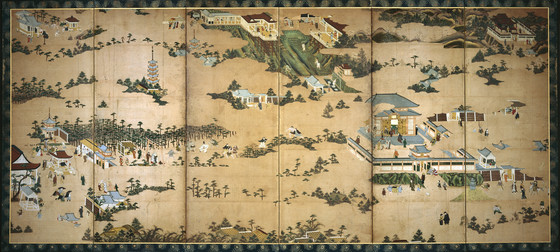 Panoramic views of Kyoto, the capital of Japan from 792 to 1868, were first painted on folding screens in the sixteenth century. Called Rakuchu rakugaizu(literally, "views in and around the capital"), the screens often depict genre scenes such as storytelling, the selling of food, the serving of tea, and occasionally musical performances, mothers comforting their children, or even servants sleeping. Invariably, these scenes include natural features such as mountains and rivers as well as important identifiable structures such as Buddhist temples and Shinto shrines. The buildings depicted can conclusively determine the date of the screens: Rakuchu rakugaizu were meant to be literal representations of the primary sites of the capital, portraying buildings that were extant at the time the screen was created.