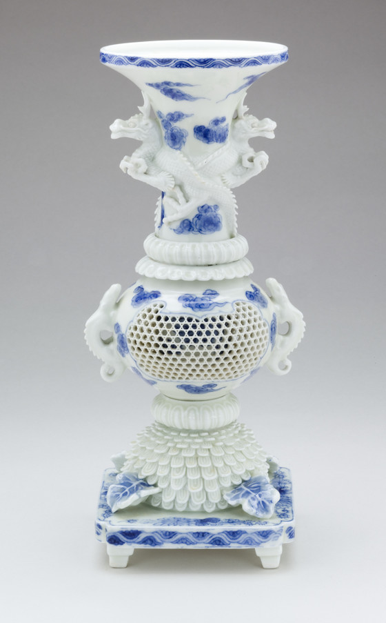 Alternate Title: 平戸三河内焼染付雲文菊龍貼付透彫広口花瓶