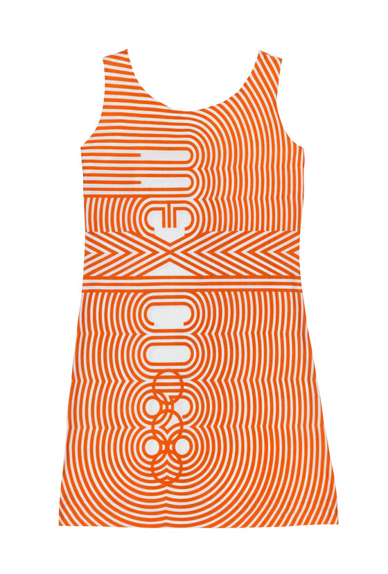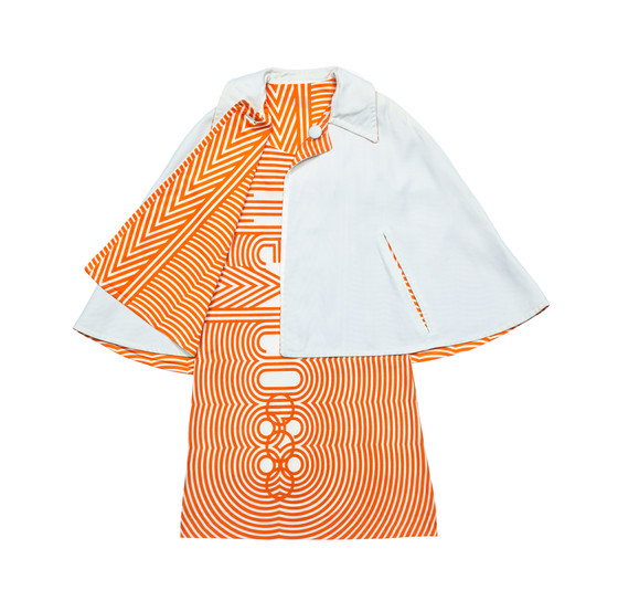 Cape: polyester knit (jersey), screenprinted, and cotton twill