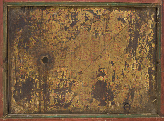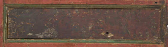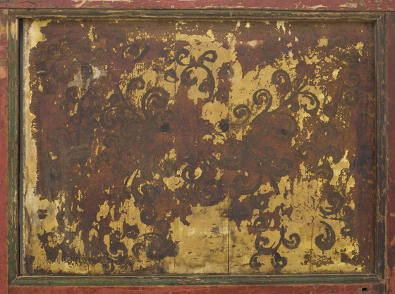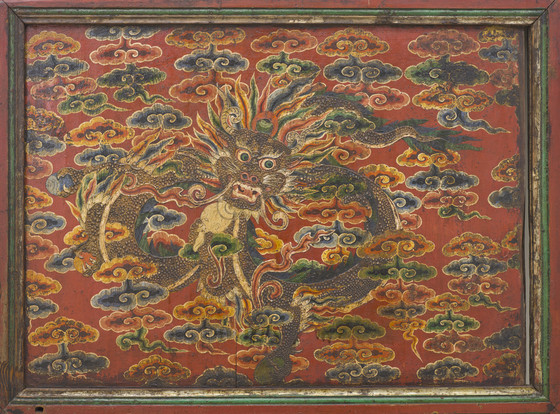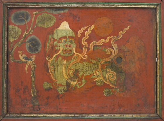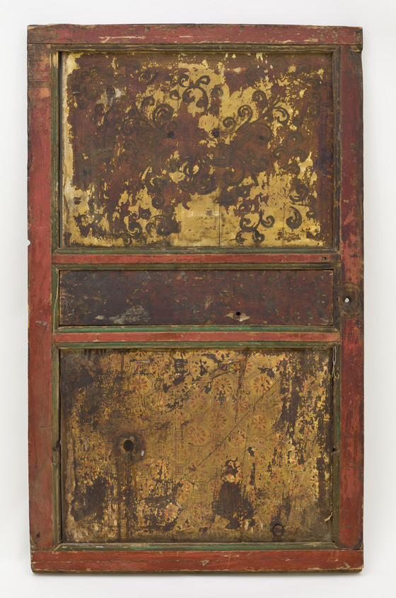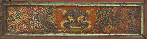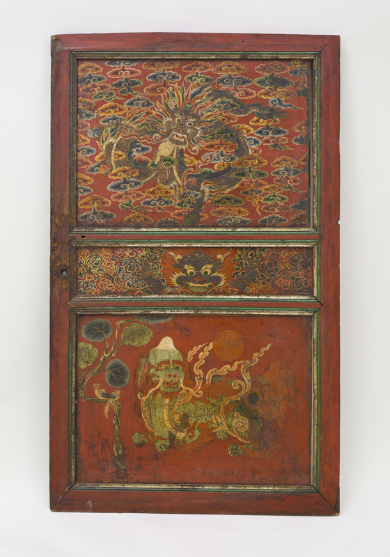 The brilliantly painted door enhanced with raised gesso (kyungbur) and gilding is divided into two main panels with a smaller dividing panel. The upper panel is embellished with a bearded dragon with streaming locks of hair and holding a conch shell and sacred jewels. It is flying through dense multicolored cloud banks. The dividing panel is graced with a mythical animal, the zipac, which is a Tibetan apotropaic symbol resembling the Indian "Face of Glory" (kirttimukha) and the Chinese gluttonous creature (taotie). Its paws are outstretched in a seizing gesture. It is set against the field of scrolling foliage. The lower panel depicts an ancient legendary creature of Tibet, the snow lion (Tibetan: gangs seng ge). It was a powerful guardian symbol of the Imperial Tibetan Empire (618–842) prior to the introduction of Buddhism in Tibet in the 7th century. It is a national emblem of Tibet and in Buddhist belief symbolizes fearless joy and spiritual purity and transformation. This snow lion unusually has a cranial protuberance symbolizing transcendental wisdom (ushnisha) in the snow-covered hemispherical form of the sacred Mount Kailash. In Buddhist cosmological thought, Mount Kailash is regarded as Mount Meru, the cosmic world-mountain connecting heaven and earth. It is a major Buddhist pilgrimage site. It is flanked on the left by a pair of birds perched on a tree trunk, a common motif in Chinese painting. On the right is an orange mountain and above is an orange Sun. A knothole below the snow lion’s tail is worn by the fingers of many devotees seeking blessings. The painted decoration on the back of the door is heavily abraded, but features a scrolling pattern in the upper panel, a flowering plant in the dividing panel, and a tortoise shell diaper pattern in the lower panel.