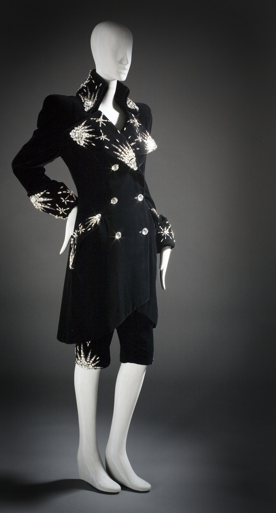 Silk velvet with rhinestone, glass sequin bead, and diamanté button trim