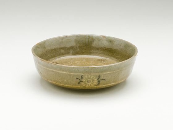 Wheel-thrown stoneware with incised and slip-filled decoration and green glaze