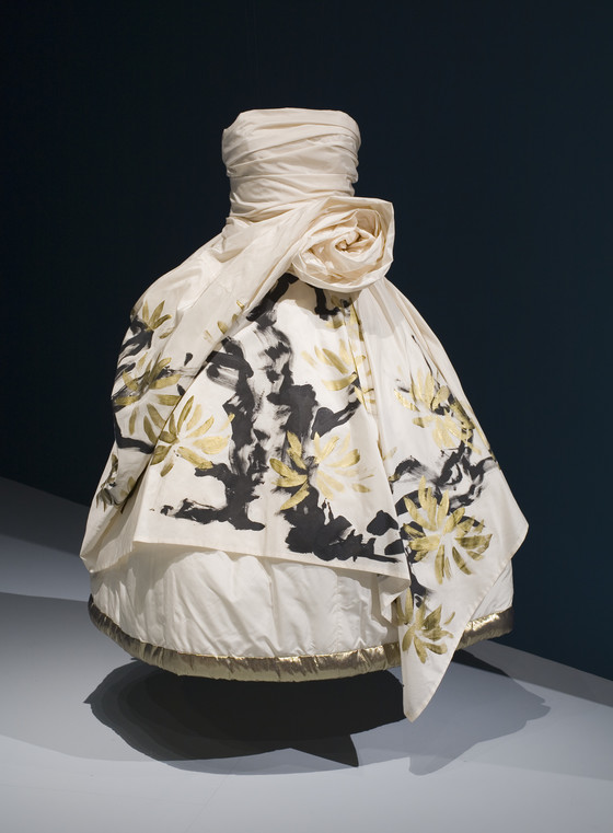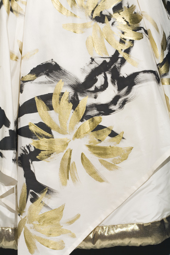 Silk plain weave (taffeta), hand-painted with ink and gold pigment, and metallic-thread plain weave (lamé)