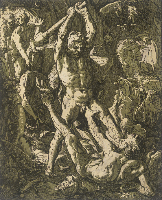 Chiaroscuro woodcut from three blocks (in tan, olive green, and black) with the addition of white heightening