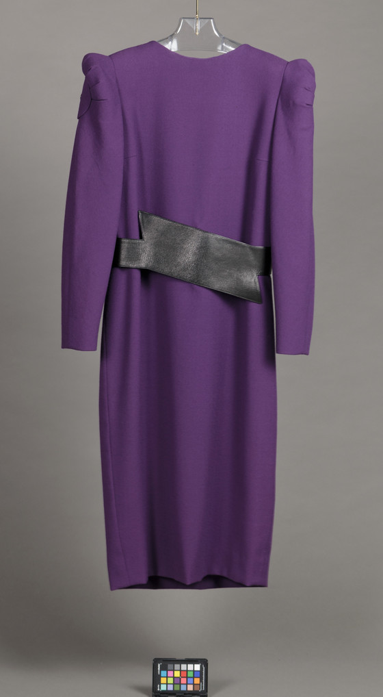 Dress: wool plain weave (crepe) with metal buttons; Belt: leather with metal snaps