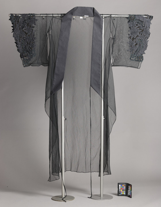 Cotton net and cotton plain weave with silk plain weave ribbon, silk and cotton lace, and cotton thread covered rings