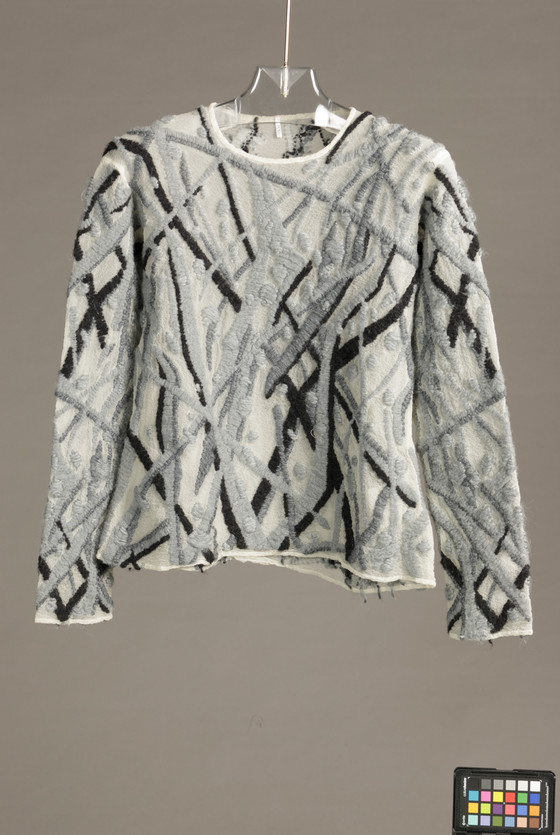 Polyurethane/polyester plain weave (crepe), heat-set pleats, with polyester embroidery