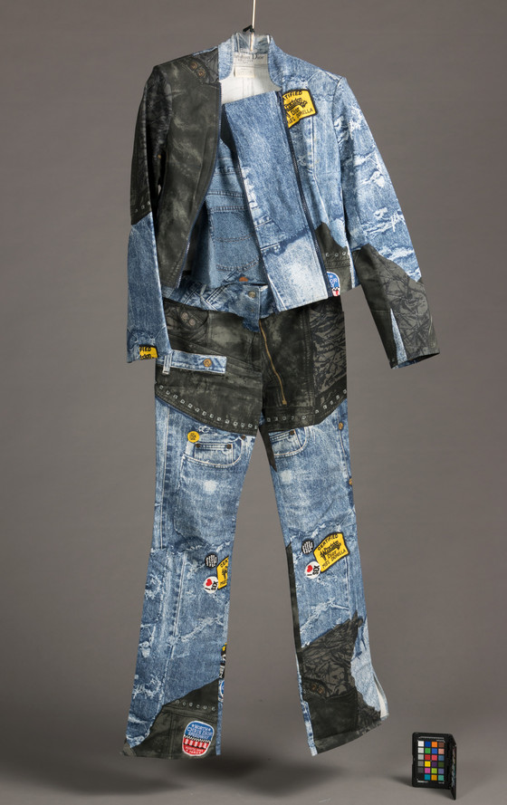 Jacket and pants: Cotton/lycra twill, printed; Blouse: cashmere knit, printed; Belt: cotton/lycra twill, printed, metal