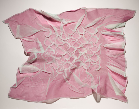 Polyester plain weave and polyurethane; transfer printed and pleated and heat- and pressure-set