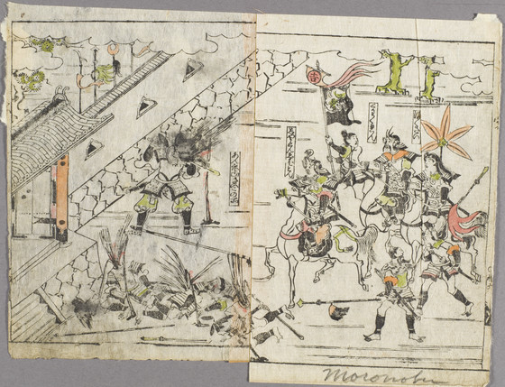 Pair of hand-colored woodblock print pages from a book (tanrokubon)
