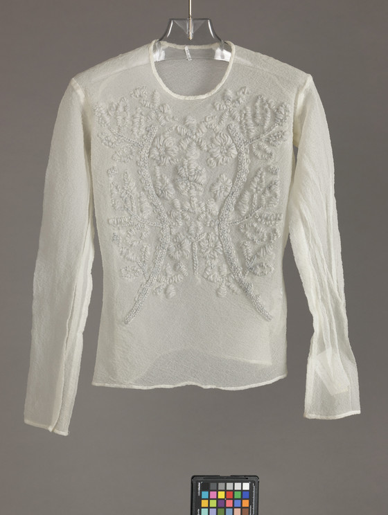 Polyester/polyurethane plain weave with heat- and pressure-set pleats and wool embroidery