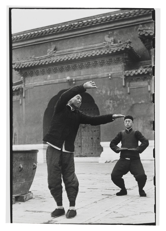 The Tai Miao gardens. Every morning at dawn, men come to do Chinese exercises. Beijing, December 1948