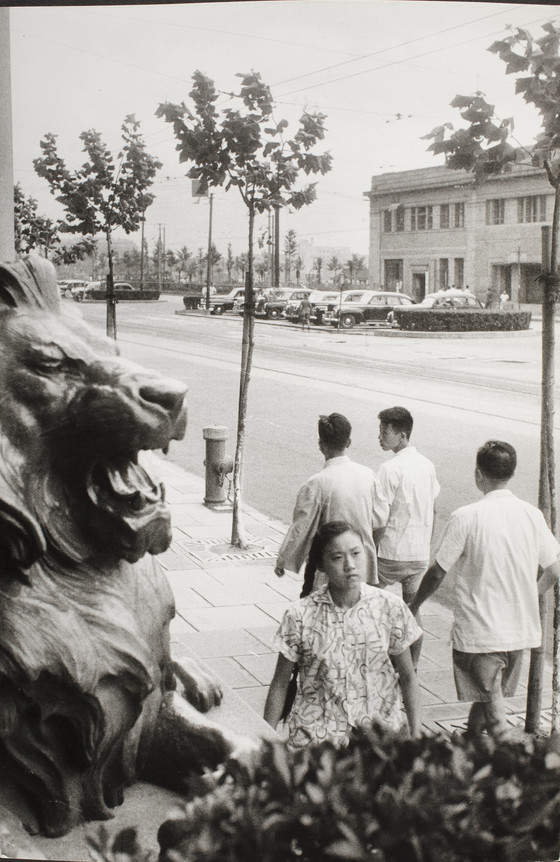 Descriptive: Lion head statue with girl and three men walking on the side walk