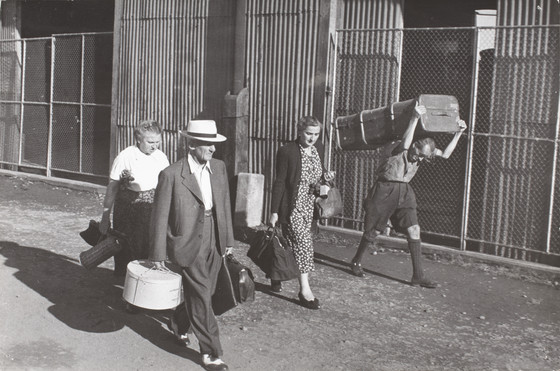 Descriptive: men and women walking with luggage