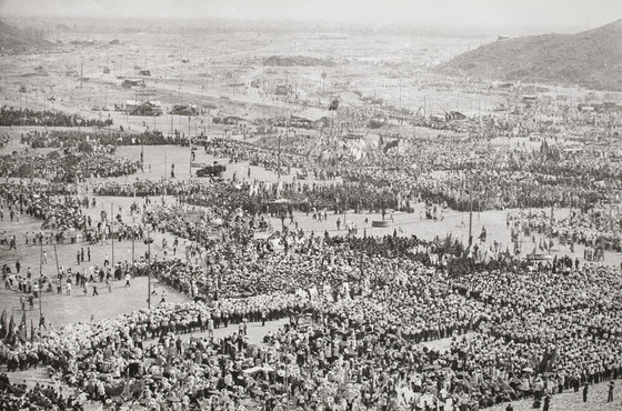 Descriptive: Aerial view of large crowd and landscape