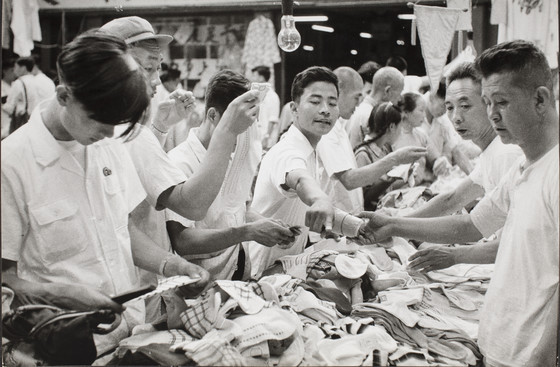 Descriptive: Marketplace with men purchasing socks