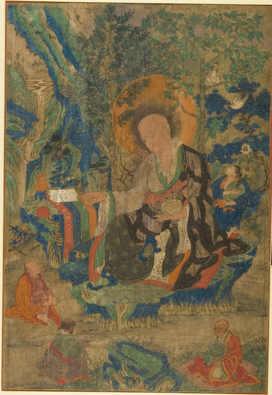This painting portrays the Arhat Pindola Bharadhvaja (Bharadhvaja with the leftover food; set no. 12). He is represented with an alms bowl (patra) in his left hand and a sacred text (pustaka) on the textile covered rock formation beside him. The awkward quality of the line in the Chinese calligraphy suggests that a non-Chinese artist or calligrapher wrote it. He is said to have a retinue of 1100 arhats, who are here represented by three monks. A robed young man behind him bears a flowering plant in a vase.