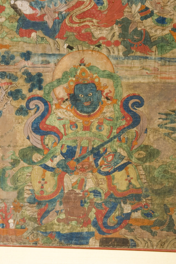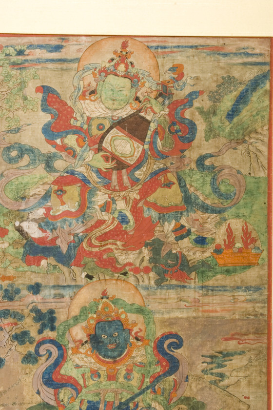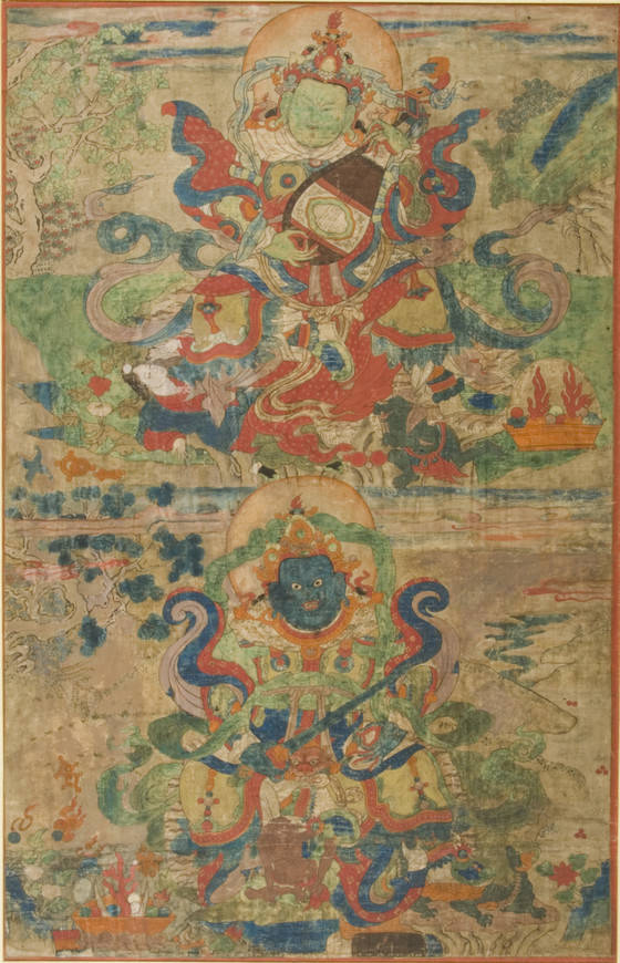This painting depicts two of the Guardian Generals of the Directions (Lokapalas). On the top, is Dhritarashtra (Whose empire is firm), Regent of the East. He is said to be white-skinned, but here is pale green. He plays a Chinese lute (pipa). On the bottom, is Virudhaka (He who has sprouted), Regent of the South. He is blue-skinned and carries a long sword. To his right are several of the precious group of seven auspicious royal gems (sapta ratna) that served as insignias for the ancient South Asian cultural concept of the Universal Monarch (chakravartin). Beside his waist are the square golden earrings of the minister. By his ankles are the golden stylized crossed swords that were the Chinese insignia of the military general. In a golden bowl at the bottom are various symbols, including the two tusks of the precious elephant, several jewels, and a branch of pink coral. To the right of the bowl are the unicorn or rhinoceros horns. To the left of the bowl are perhaps two texts with silk covers. Both Regents are clad in Mongolian garb. See also M.77.155.3 and M.82.169.22.