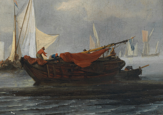 (4) The entry for the painting in the 1958 sale catalogue incorrectly states that the painting was "From the Collection of Joseph Bernhard," rather than Joseph Barchard. According to an annotation made by Ellis K. Waterhouse on p. 16 of the Getty Research Institute’s copy of the 2 July 1958 sale, "Mainly bt. by Joseph Barchard, a client of Nieuwenhuys at the beginning of the 19th century. He bequeathed them to Francis Barchard, thence to Elphinstone Barchard, great uncle of [?] Francis Barchard whose widow is the vendor [Mrs. Maud Barchard]. (He died ca. 1932.)" It was apparently the elder Francis Barchard who lent the painting to the Royal Academy of Arts, London, in 1875. According to Mireur 1911–12 (2001), vol. 7, p. 312, in 1828 (sale not identifiable) J[oseph] Barchard sold another painting, Un calme, which had been in the sale of the duc de Choiseul in 1772 and described by Mireur, p. 311, as "Un calme. Vers la droite, un vaisseau navigue sous des oiles de misaine et de hune; une barque est a gauche et plus loin, au fond, on apercoit deux fregates, un sloop et quelques batiments. Bois (23.6 × 27.9)."