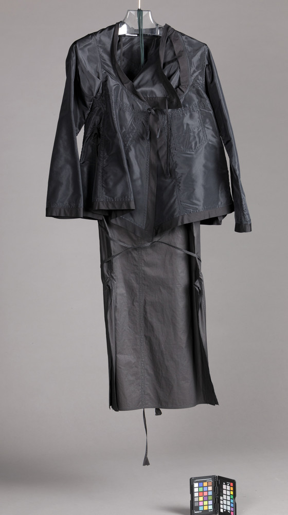 Jacket: Silk plain weave (faille), cotton plain weave, cotton embroidery. Skirt: cotton plain weave, cotton embroidery.