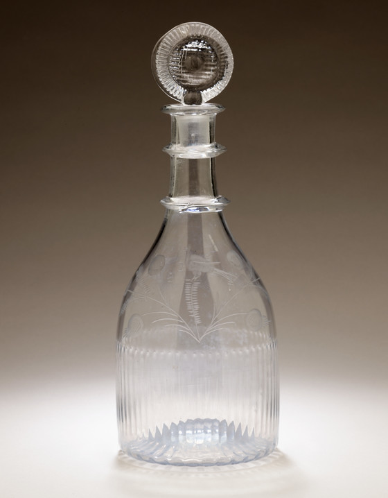 a) Decanter height: 9 in. (22.86 cm); a) Decanter diameter: 4 in. (10.16 cm); b) Stopper height: 3 1/4 in. (8.26 cm); Overall height: 11 in. (27.94 cm); Overall diameter: 4 in. (10.16 cm)