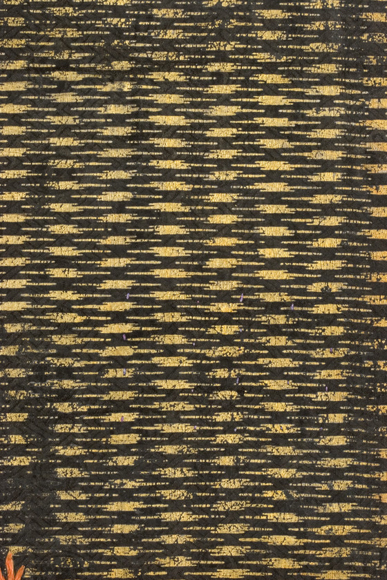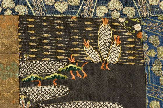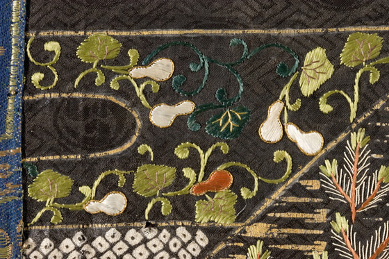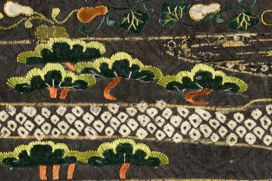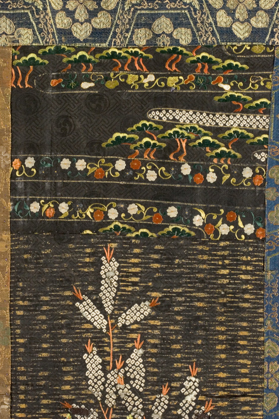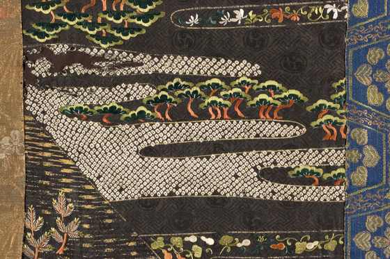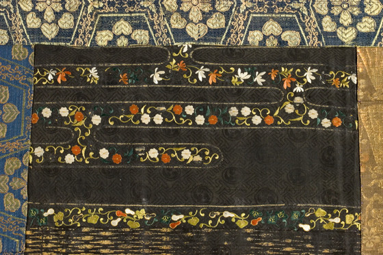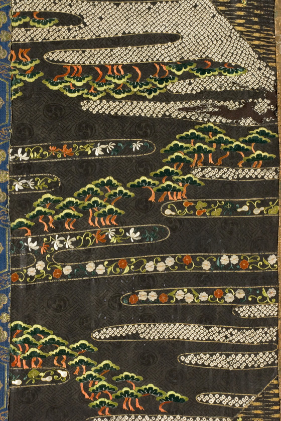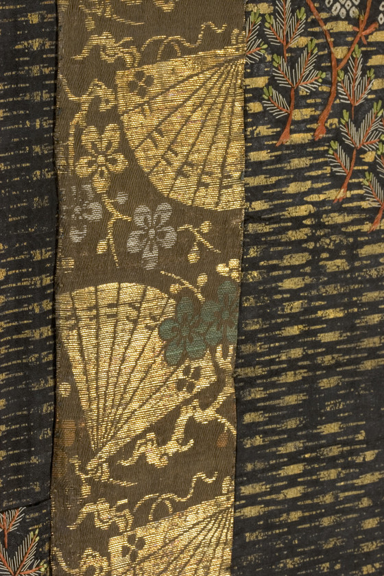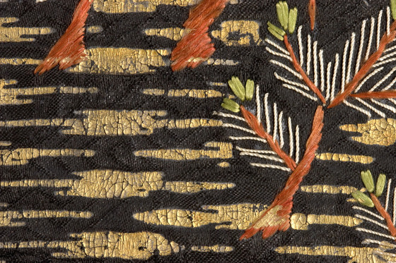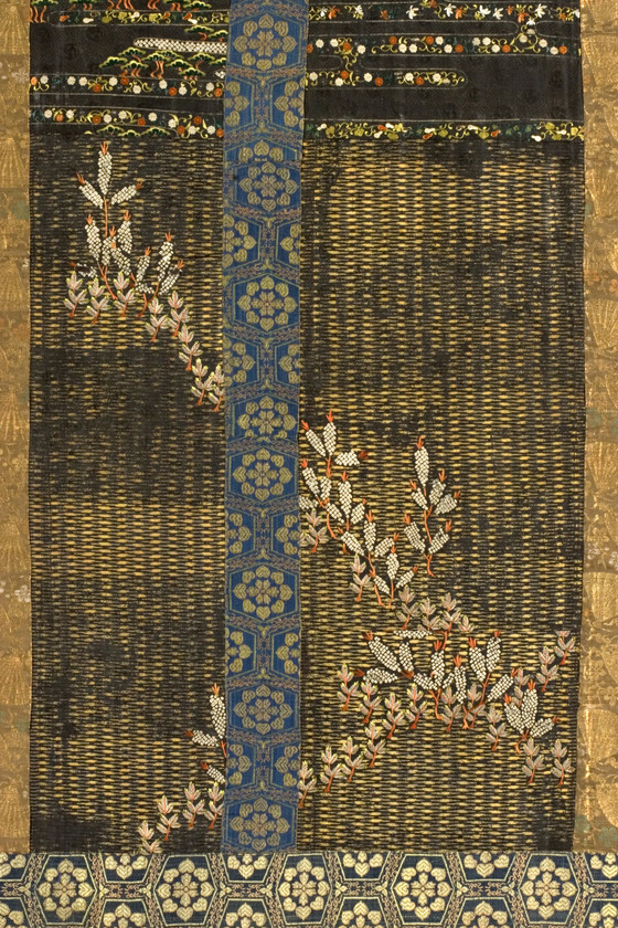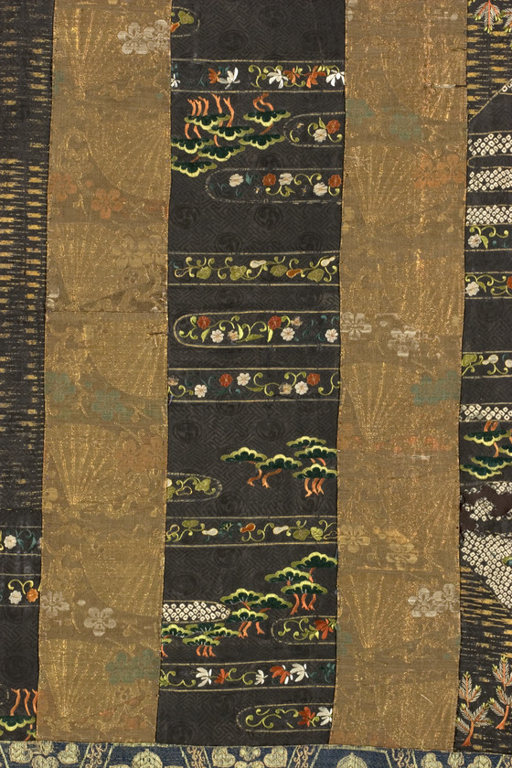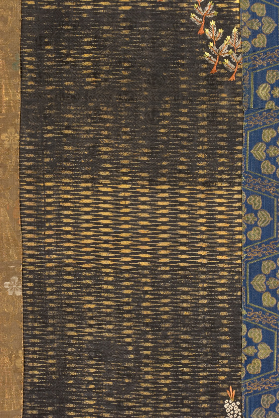 Silk figured satin (rinzu) with tie-dye (kanako shibori), silk- and gilt -paper wrapped silk-thread embroidery, and gold leaf (surihaku); silk twill with gilt-paper thread supplementary weft patterning trim
