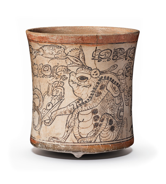 Elegantly painted ceramic vessels constituted the premier form of artistic expression during the Late Classic period (550-850 AD) of ancient Maya civilization, and none were more beautifully painted than those known as codex style. Named for their resemblance to the Maya codices, or painted books, codex style ceramics such as this Drinking Vessel depict highly esoteric scenes describing the fundamental concepts of Maya religious belief and practice and the special role of kings as participants in the supernatural realm. These concepts are embedded within a layered matrix of complex imagery and hieroglyphic writing that describe the ritual actions of rulers, who engaged with ancestors and supernatural beings in order to maintain the delicate balance of the cosmos.