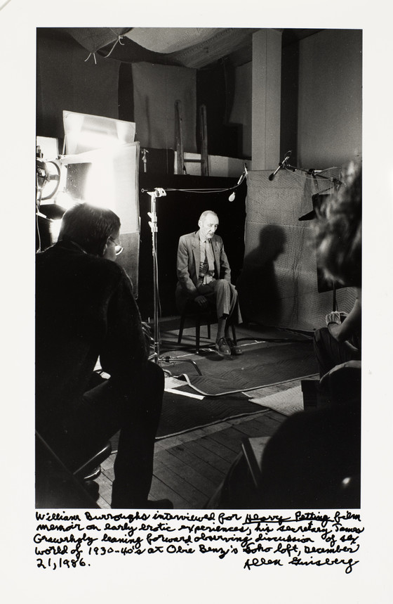 William Burroughs, film interview Soho, New York, December 21, 1986, secretary Jim Grauerholz leaning forward observing discussion of world of 1940s, memoirs