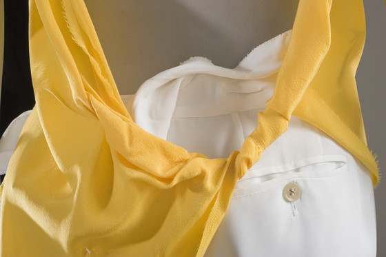 Blouse: silk plain weave (crepe), elastic; Pants: polyester plain weave