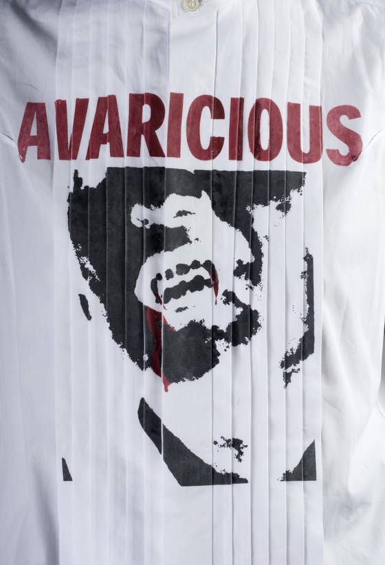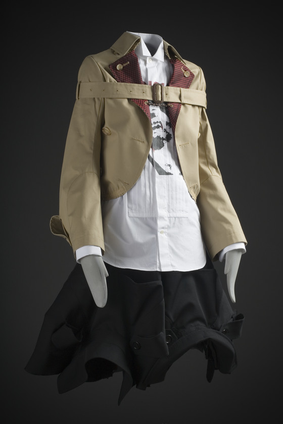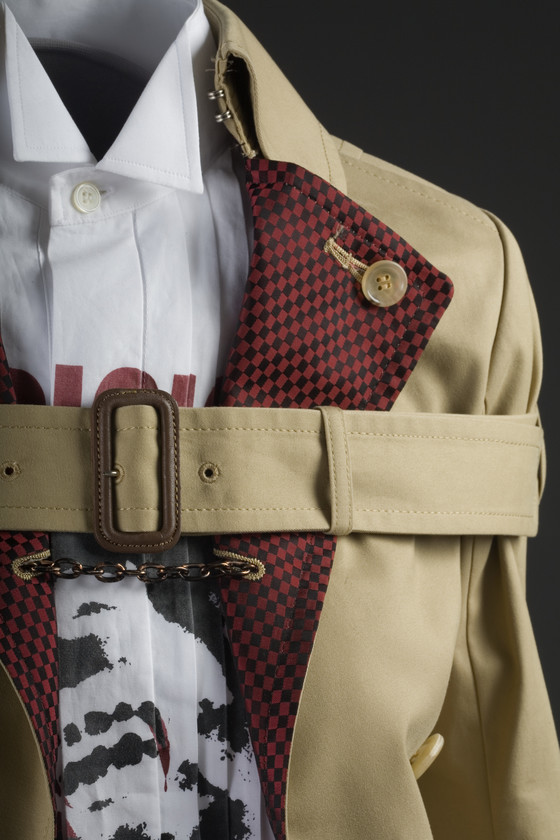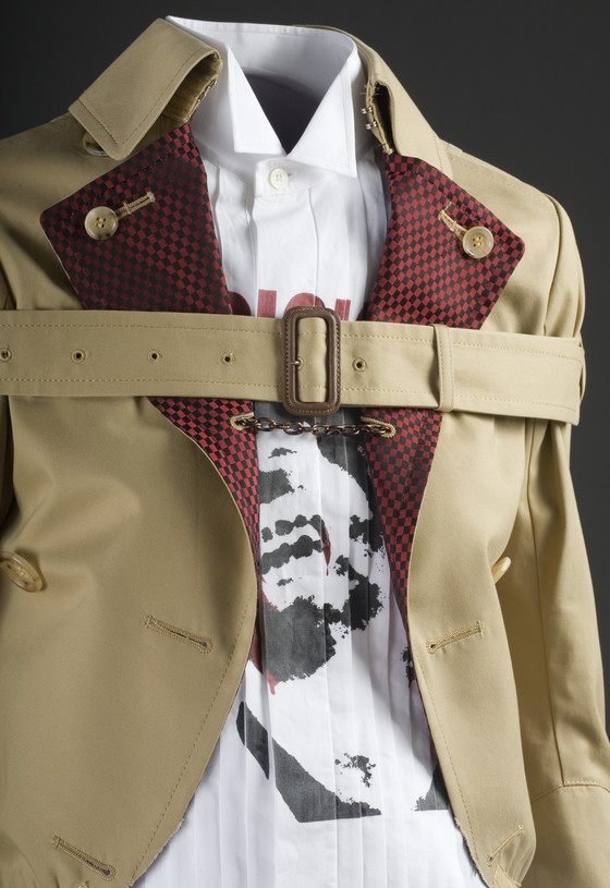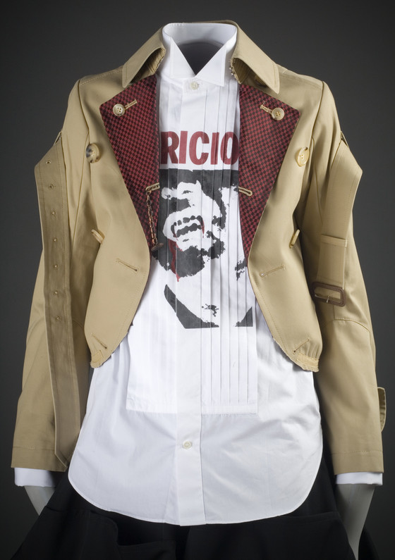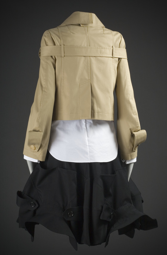 Jacket: Cotton twill, rayon figured twill; Belt: Cotton twill, metal