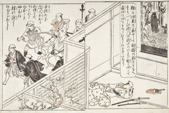 Black and white woodblock print with hand-coloring