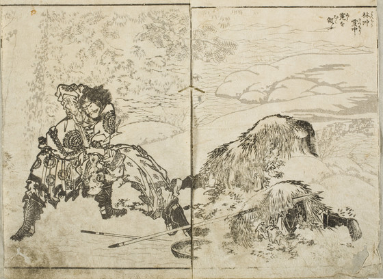 Double-page book illustration; black and white woodblock print