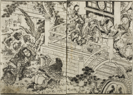 Double-page book illustration; black and white woodblock print