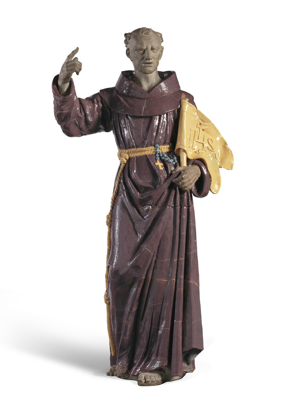 This rare, nearly life-sized Renaissance statue by Santi Buglioni (1494—1576) is believed to represent Saint John Capistran and dates from about 1550. It is made of glazed terra-cotta and worked completely in-the-round. Several full-size glazed terra-cotta statues from the Renaissance are known, but most remain in the churches and sanctuaries in Tuscany for which they were originally commissioned.