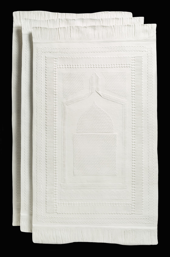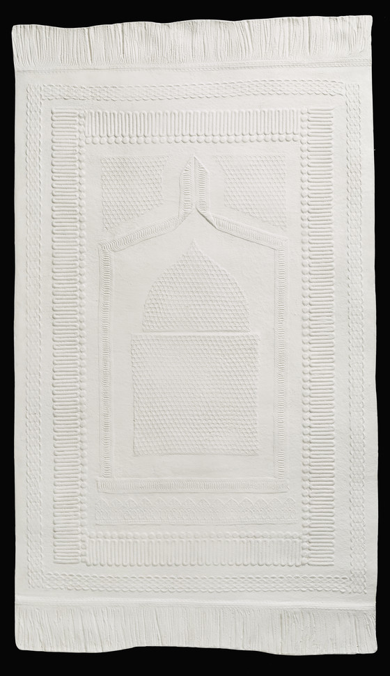 As part of their daily prayer rituals, Muslims perform a series of bows and prostrations while facing toward Mecca, which include touching their heads to the ground. Mats or rugs provide a soft, clean, and personal space, especially as prayer is often said in private rather than in congregation. This trio (see M.2016.1.3, .5) of mold-made resin carpets emulates the traditional prayer carpet with a niche design in the center pointing toward the qibla, or direction of prayer. Given their hard material, these are symbolic rather than functional carpets, signifying the importance of the act of prayer five times a day, which is one of the Pillars of Islam. Maïmouna Guerresi is an Italian-born artist who converted to Islam, joining a Sufi community in Senegal in the early 1990s. Today she divides her time between Verona, Milan, and Dakar, working in photography, video, sculpture, and installation art. Her personal and professional background, along with the strong emphasis she places on her faith and spiritual transformation as visualized through her art, makes her a natural fit within the genre of Islamic art today. Her resin carpets demonstrate further her great versatility and help situate her work within the tradition of Islamic art.