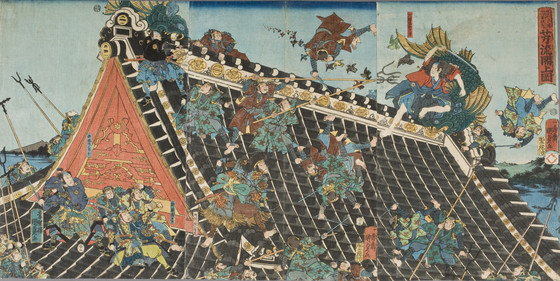 Battle on roof of Hōryūkaku, from the Play "Tale of the Eight Dogs" (Hakkenden)
