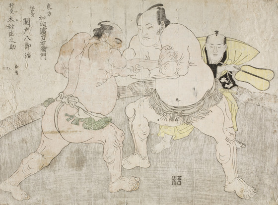 Wrestlers Kajigahama Rikiemon of the Eastern Group and Sekinoto Hachirōji of the Edo tea, with the Umpire Kimura Shōnosuke