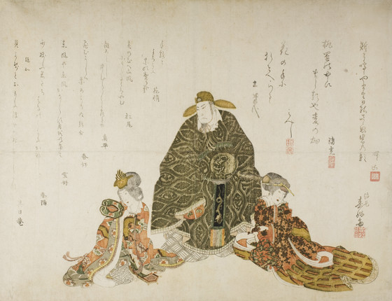 Color woodblock print, surimono; brass and tin