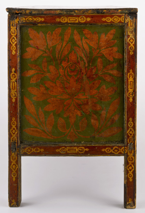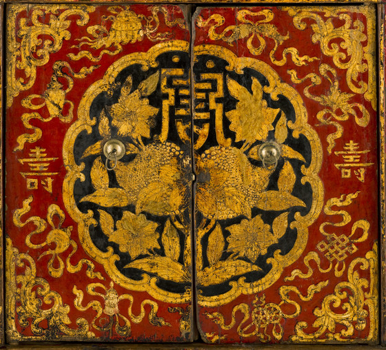 Wood with mineral pigments, gold leaf, and gesso; brass fittings