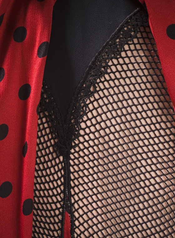 Dress: rayon/acetate twill, silk satin, rayon acetate lace and fishnet; Necklace: metallic chain and faux pearls