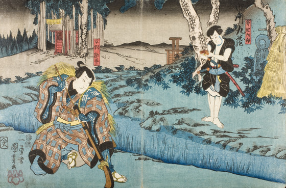 Descriptive: The actors Sawamura Chōjūrō V as the farmer Hayano Kanpei kneeling and loading his gun (left) and Ichikawa Kuzō II as Ono Sadakurō holding up a stolen purse (right), in a scene from the kabuki play Kanadehon Chūshingura